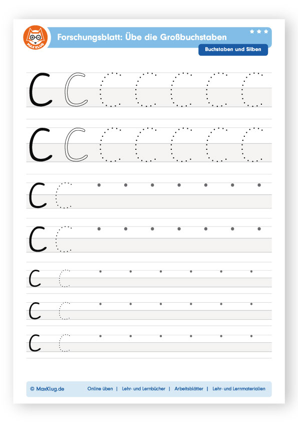 Eine der wichtigsten Grundlagen in der Schule ist das Schreiben. Viele Kinder lernen anstelle einer Druckschrift direkt eine Grundschrift, womit sie schnell zu einer eigenen flüssigen und verbundenen Handschrift gelangen sollen. In dem PDF-Paket zu Grundschrift für den Buchstaben C von Max Klug gibt es deshalb viele verschiedene Übungen, um die Motorik des Schreibens zu erlernen. Ganz einfach die Arbeitsblätter ausdrucken und direkt loslegen.